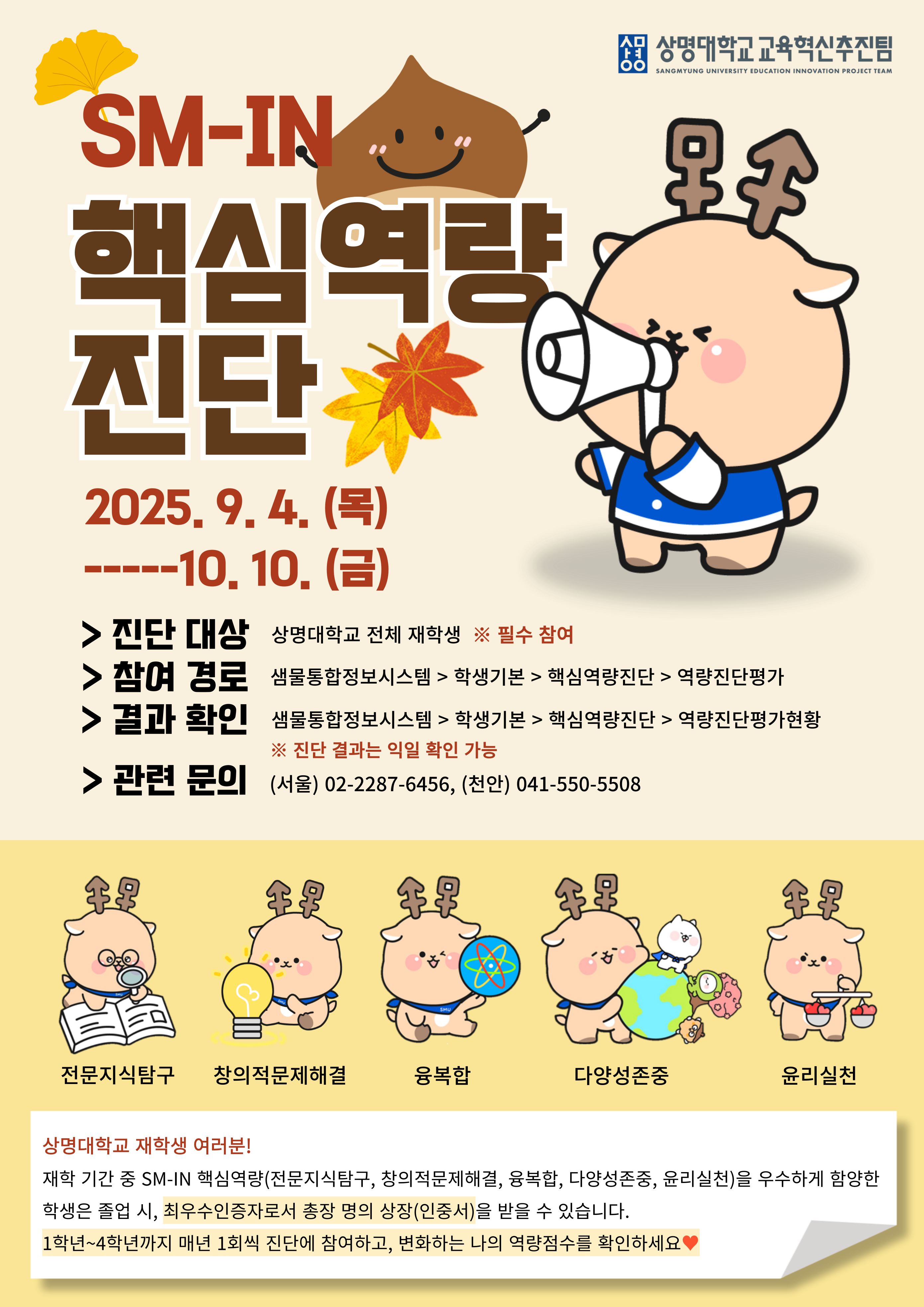 우리 대학 전체 재학생의 SM-IN 핵심역량 진단을 통해 입학부터 졸업까지 역량 수준을 추적 하고 더 나아가 우리 대학 SM-IN 핵심역량 함양도를 측정하고자 하오니 재학생 여러분의 적극적인 참여 바랍니다.