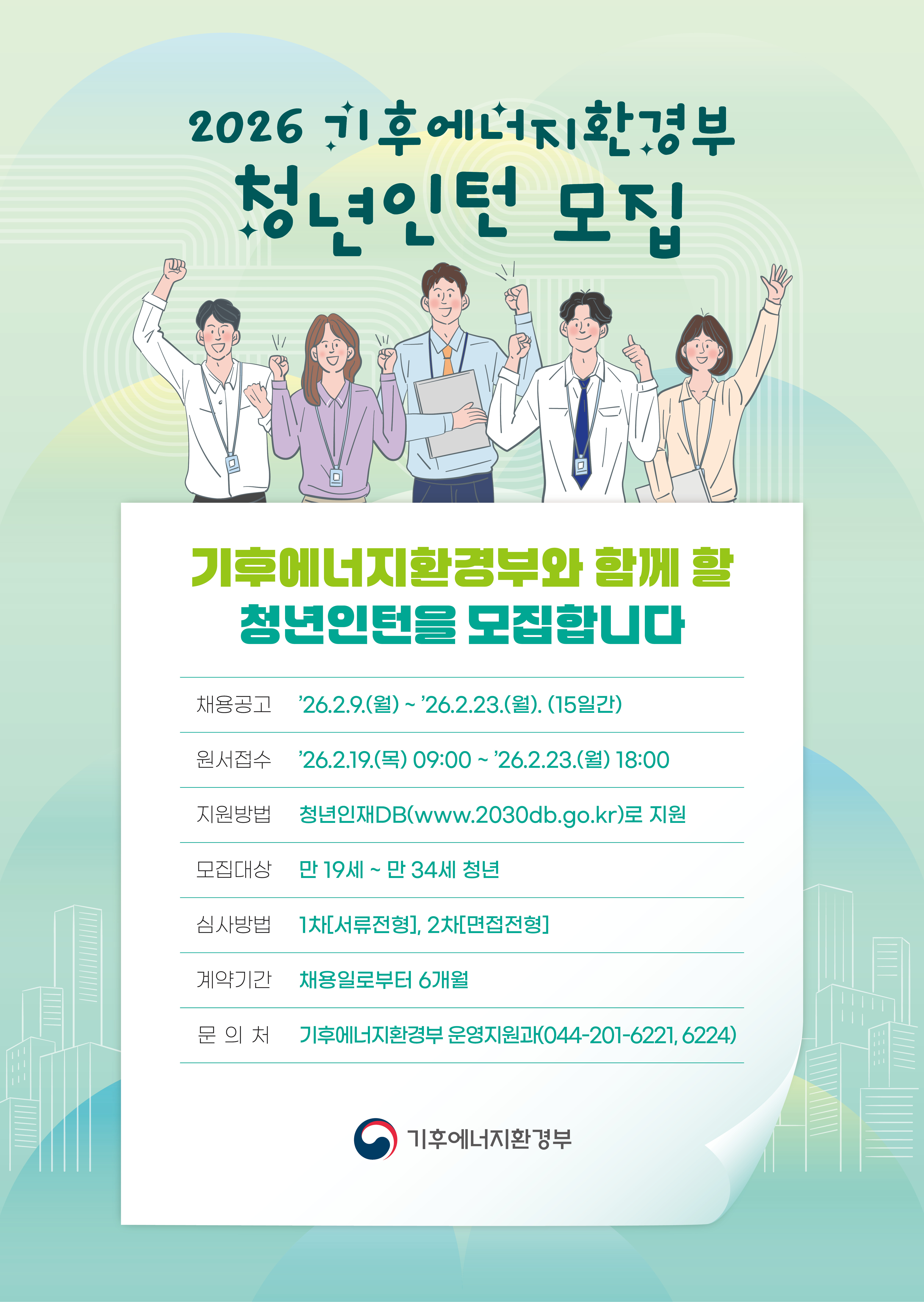 26년 기후에너지환경부 청년인턴 채용 관련 홍보포스터를 게시하오니 많은 관심 바랍니다.