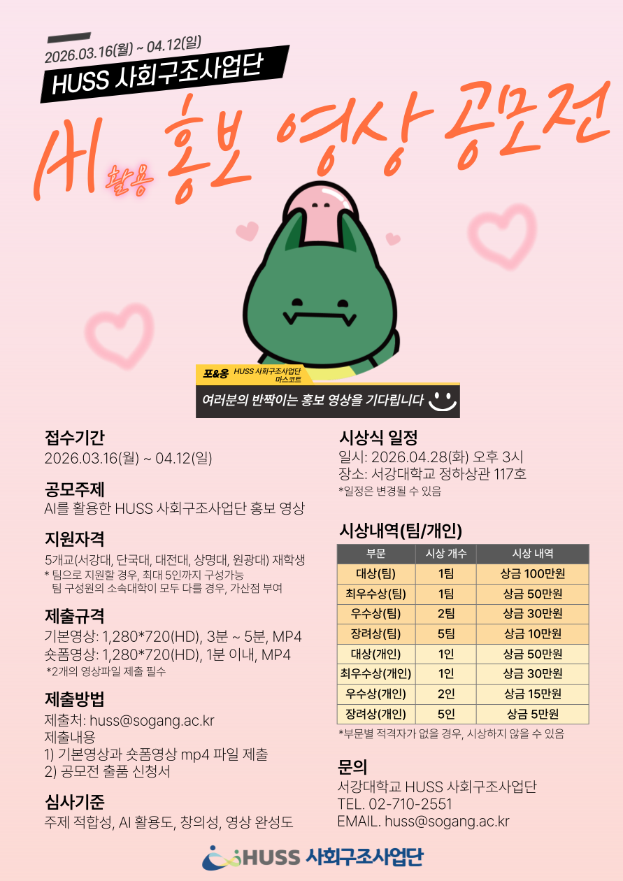 [HUSS 인문사회융합인재양성사업단] 'HUSS 사회구조사업단 AI 활용 홍보 영상 공모전' 안내